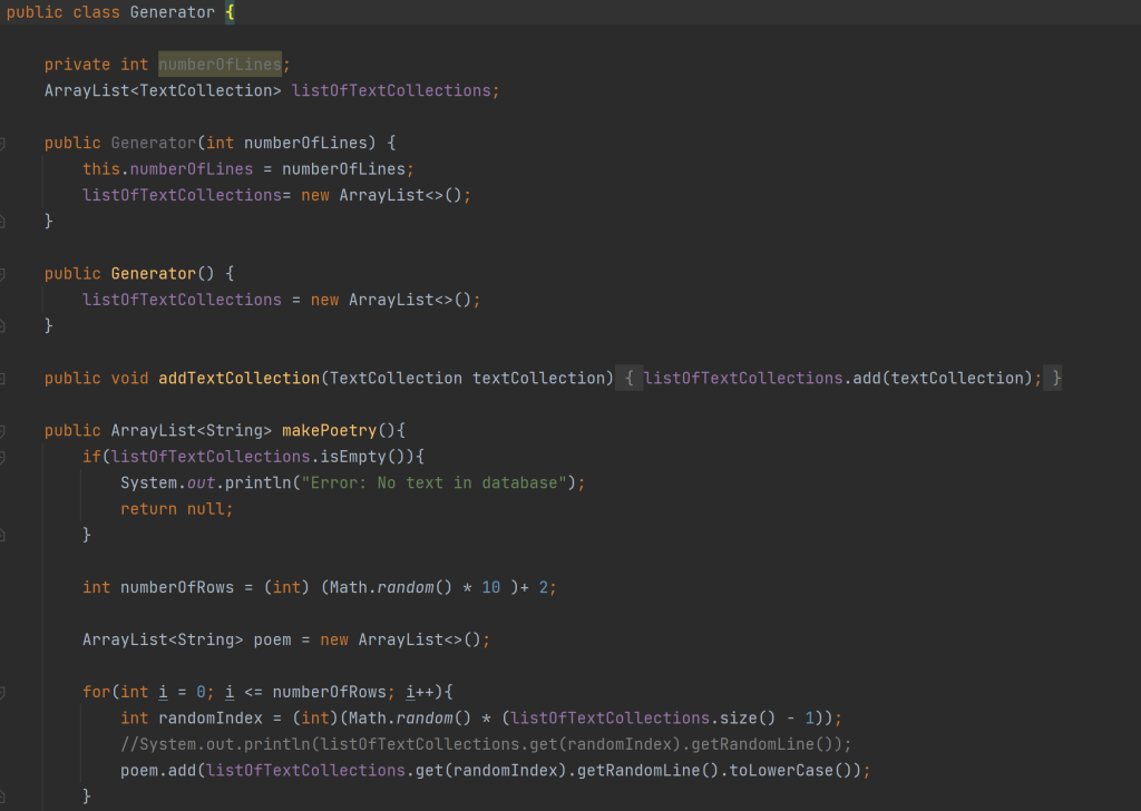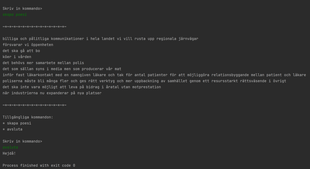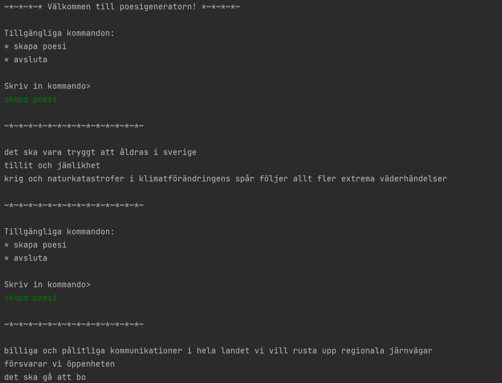 A simple poetry generator that seperates lines from the text-files it’s fed with and combines them into poetry. The Poetry Generator is currently fed with the election manifesto from the Swedish election in 2022.